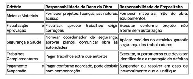 A divisão de responsabilidades entre dono da obra e empreiteiro durante a execução de um contrato de empreitada em Portugal é determinada por critérios legais, contratuais e técnicos, refletindo o equilíbrio entre direitos, deveres e riscos de cada parte.